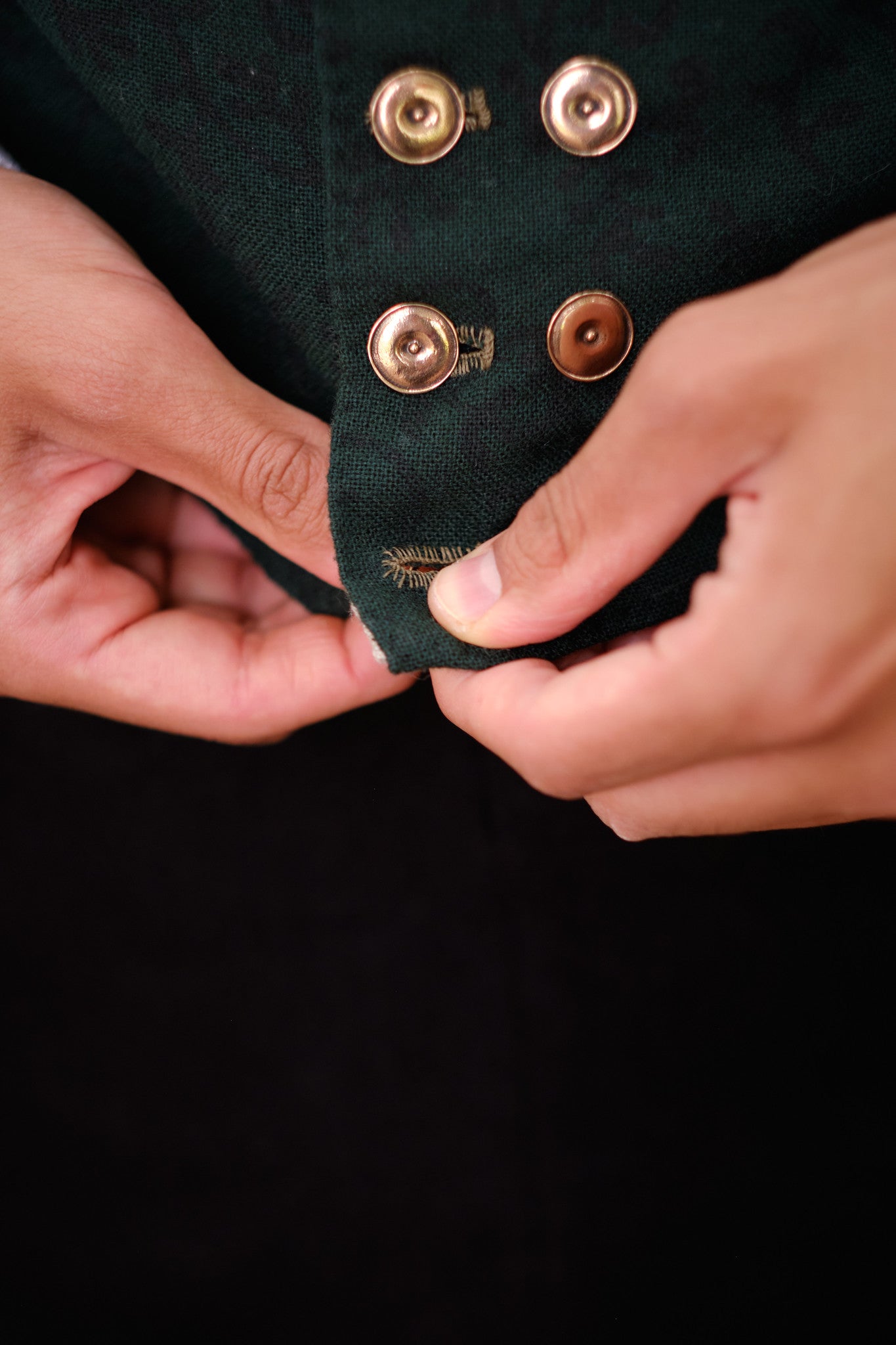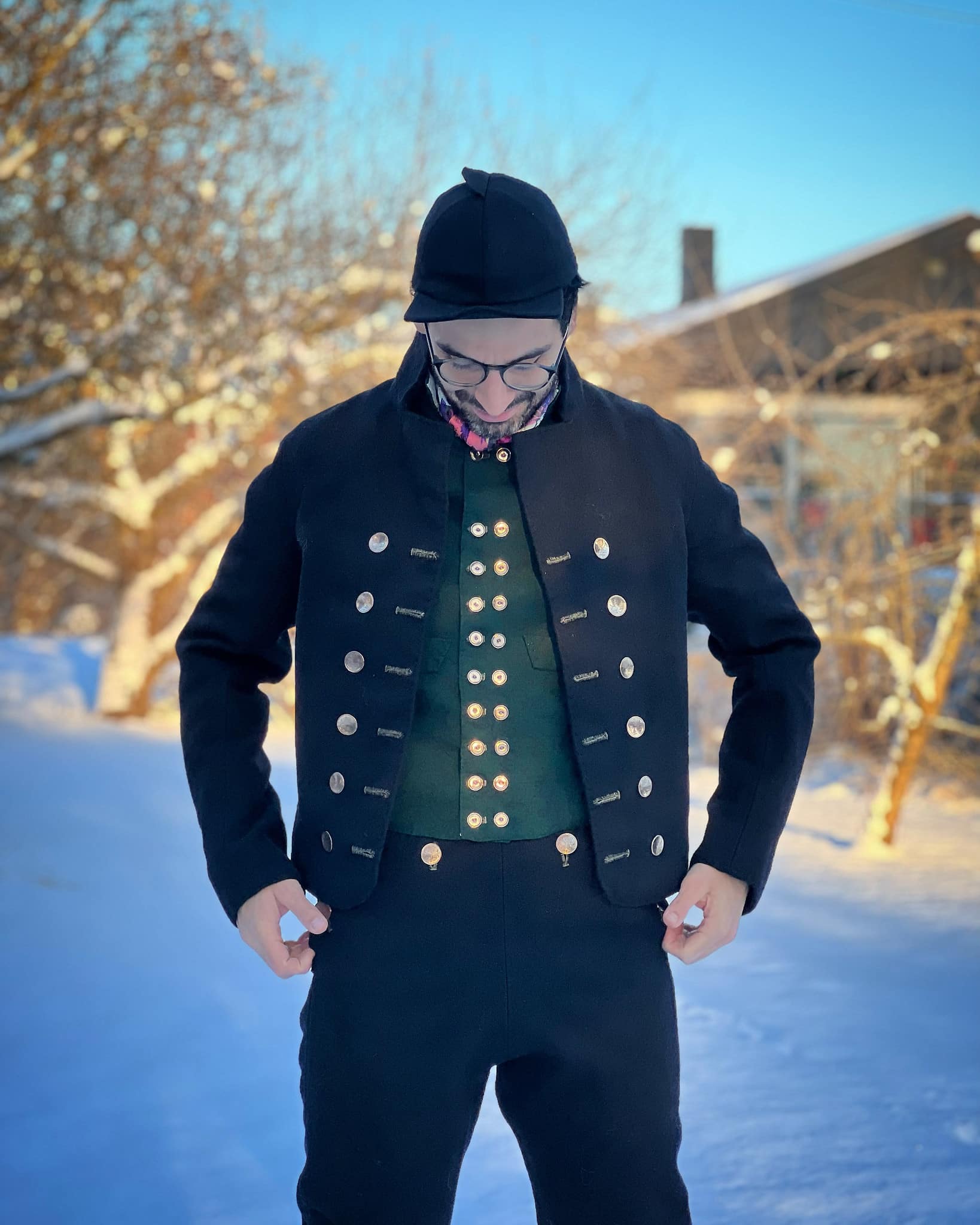 Østerdalsbunad for herre er en autentisk rekonstruksjon av plagg fra Østerdalen på 1800-tallet. Den består av nikkers og trøye i svart vadmel, en ullvest med trykk i rustrødt, grønt eller blått, samt en skjorte i bomull eller brodert lin. Bunaden har detaljer som messingknapper, knespenner og valgfritt hodeplagg – enten skjoldlue eller strikkelue. Tilbehør som sølje, hosebånd, strømper, bukseseler og silkesjal kan fullføre antrekket. Hos Hulda Bunader finner du materialpakker, kvalitetsstoff og tilbehør for å sy din egen Østerdalsbunad.